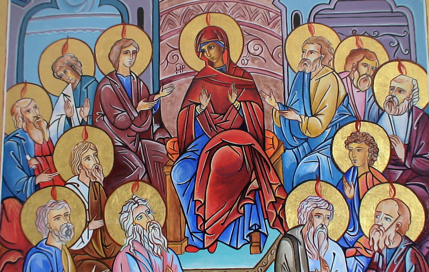 En un circulo de esferas cósmicas está Cristo sentado en majestad, por eso sus vestiduras ya no son blancas sino del color de la realeza. Con su mano derecha bendice y al mismo tiempo envía. En la izquierda tiene el rollo de las Escrituras que contienen el anuncio de la Buena Noticia para ser acogida libremente por cada hombre. Es el envío a evangelizar: