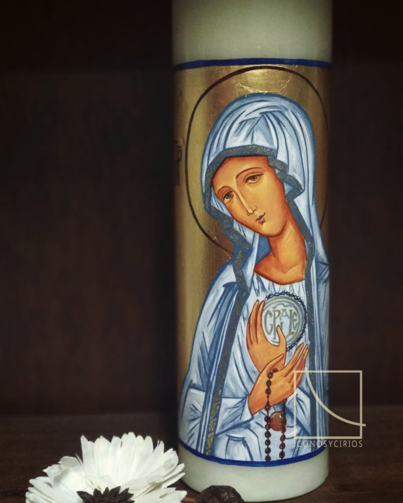 - Estamos realizando dos cruces distintas: para el Pantocrátor y el cirio del icono pintaremos una cruz sobre el oro, en el caso del cirio con estilo románico diseñamos y pintamos sobre la cera una cruz elavorada.
