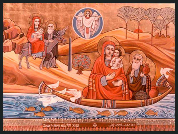 La Sagrada Familia vive alrededor de un mes en el antiguo Cairo, refugiándose en una cripta donde ahora se encuentra la Basílica de San Sergio o de la Sagrada Familia, alertados por las intenciones de Herodes.